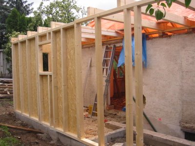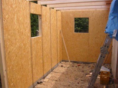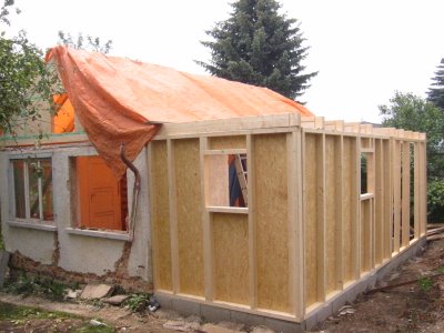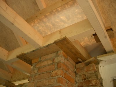 das dach ist dicht dank blauer folie. hat der schornstein schon seine endgültige höhe erreicht?